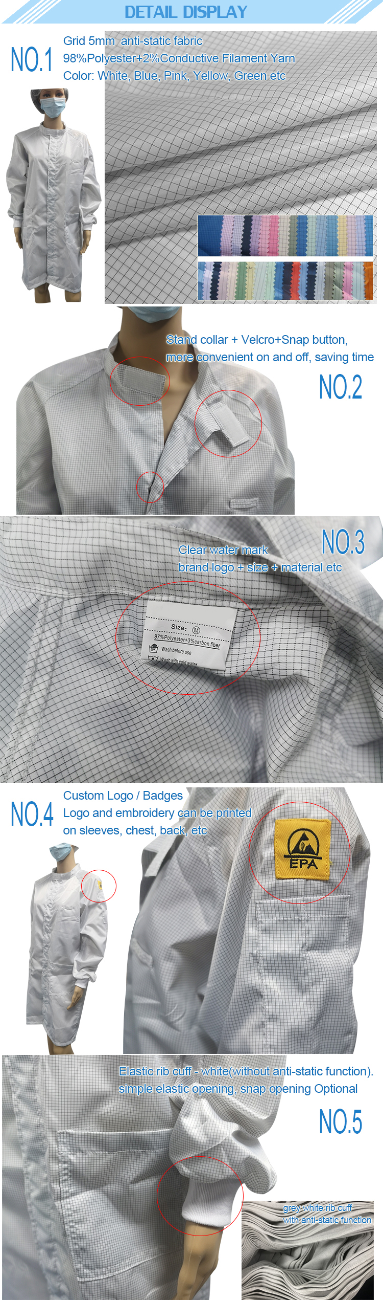 Debido a las tecnologías, la bata ESD de rejilla antiestática multicolor para salas limpias de varios tamaños para áreas EPA puede mantener sus propiedades químicas y físicas estables. Después de haber superado las pruebas pertinentes, se ha demostrado que el producto es adecuado Ropa de seguridad.